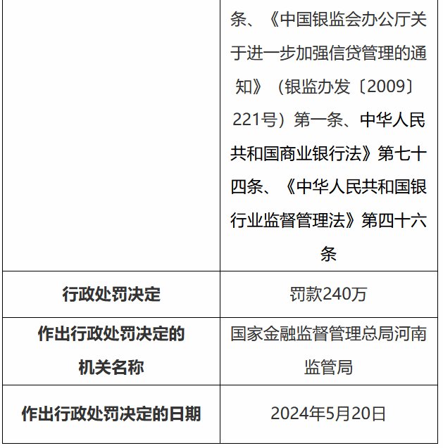 5月24日金融一线音书,国度金融监督处置总局(河南监管局)行政处罚信息公开暴露出世博体育,中国栽培银行股份有限公司河南省分行因五项坐法违法事实,被罚金240万元。