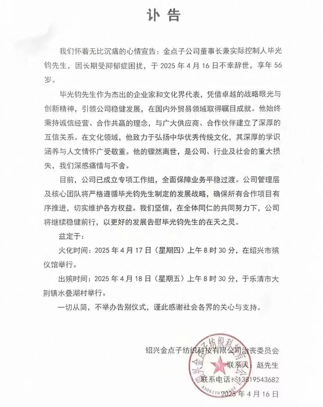 4月16日,浙江绍兴金点子纺织科技有限公司治丧委员会发布一则讣告,金点子公司董事长兼本体抑止东谈主毕光钧先生,因长期受抑郁症困扰,于2025年4月16日苦难离世,长年56岁。