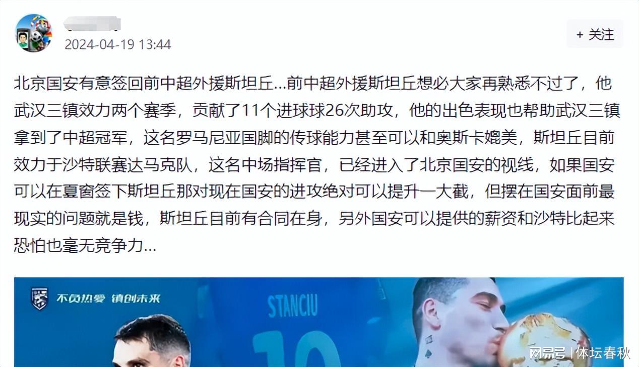 不错说,斯坦丘恰是咫尺国安最穷苦的外助类型。不外,国安咫尺果然有钱引进这位罗马尼亚中场吗?要知说念,斯坦丘咫尺的转会身价高达500万欧元,况且与达马克俱乐部还有1年多的公约。
