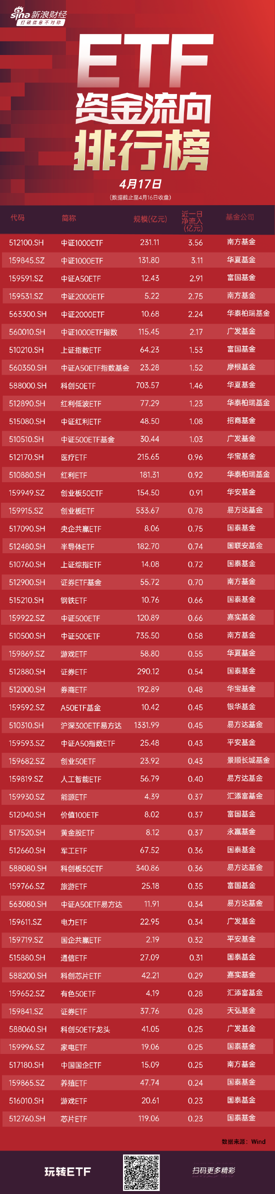 Wind数据透露,4月16日,南边中证1000ETF获净申购3.56亿元,中原中证1000ETF获净申购3.11亿元,富国中证A50ETF获净申购2.91亿元!一图看懂昨日股票ETF净申购TOP50>>